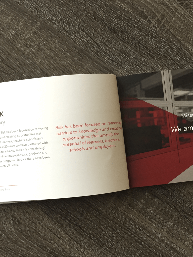 To re-establish the Bisk brand. Despite Bisk’s success over nearly half a century, the company had begun to lose sight of the principles it was founded on. In losing focus of its primary goal — to improve the learning experience — Bisk was falling behind its competitors in key operational areas.